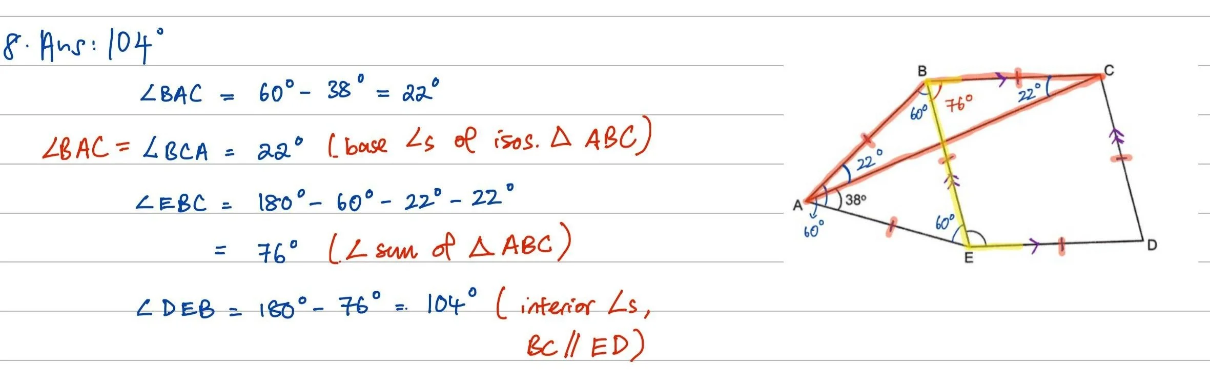 ∠EBC = 180˚ - 60˚ - 22˚ - 22˚ = 76˚ (∠ sum of ∆ABC)